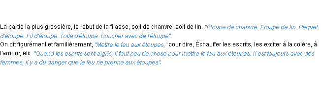 Ancienne signification éditée en 1835 pour le terme « étoupe » par l’Académie Française.