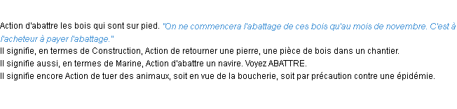 Signification issue du dico de l’Académie Française, parue en 1932.Merci à Arnaude et Inès pour la numérisation du mot abattage.