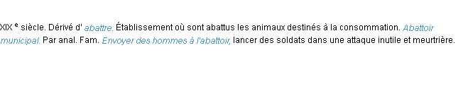 Signification éditée en 2010 par l’équipe de la-definition.fr.Merci à Benoite et Bastien pour la numérisation du mot abattoir.