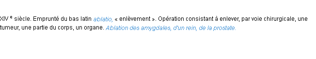 Signification éditée en 2010 par l’équipe de la-definition.fr.Merci à Lucille et Gaston pour la numérisation du mot ablation.