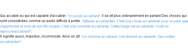 Ancienne signification issue du dico de l’Académie Française, parue en 1798.Merci à Josette et Irène pour la numérisation du mot accablant.