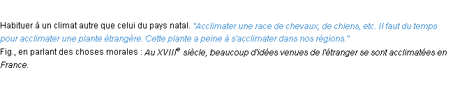 Définition de « acclimater » de source académique (Académie Française, parution de 1986).