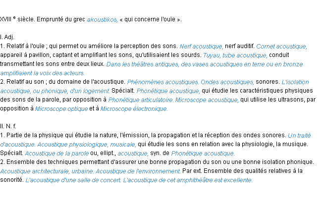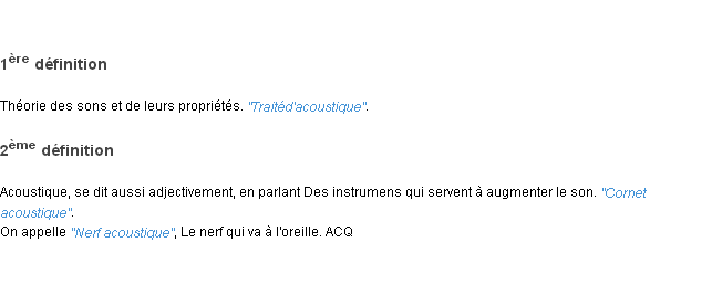 Ancienne définition de « acoustique » de source académique (Académie Française, parution de 1835).