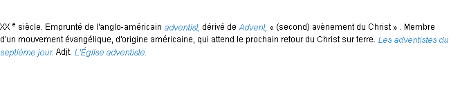 Définition issue du dictionnaire wiktionary pour le mot « adventiste ».Merci à Barnabé et Hilaire pour la numérisation du mot adventiste.