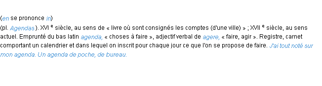 Ancienne signification éditée par l’Académie Française, année 1798.Merci à Gautier et Claudette pour la numérisation du mot agenda.