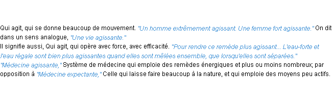 Ancienne signification éditée en 1798 pour le terme « agissant » par l’Académie Française.