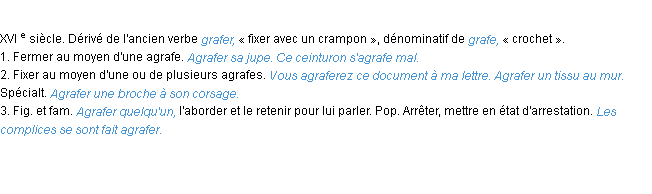 Définition de « agrafer » de source académique (Académie Française, parution de 1986).