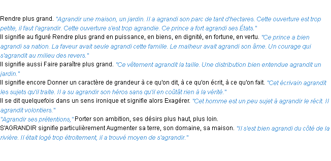 Ancienne définition « agrandir » du dictionnaire académique Français, parution de l’année 1798.Merci à Eloi et éloise pour la numérisation du mot agrandir.