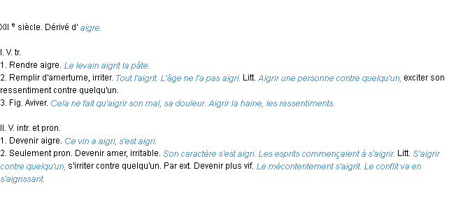 Ancienne définition de « aigrir » de source académique (Académie Française, parution de 1798).Merci à Noella et Odile pour la numérisation du mot aigrir.