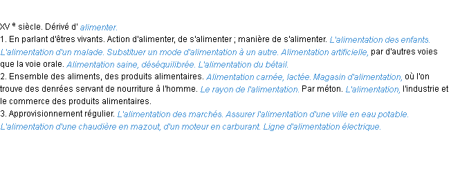 Signification éditée en 2010 par l’équipe de la-definition.fr.Merci à Maxime et Josée pour la numérisation du mot alimentation.
