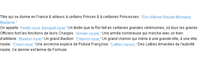 Ancienne signification éditée en 17962 pour le terme « altesse royale » par l’Académie Française.Merci à Claudette et Noel pour la numérisation du mot altesse royale.