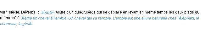 Ancienne signification éditée en 1798 pour le terme « amble » par l’Académie Française.Merci à Didier et Océane pour la numérisation du mot amble.