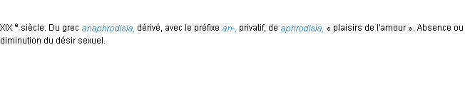 Définition développée dans dictionnaire d’Emile Littré (ancienne édition de 1876).Merci à Gautier et Alain pour la numérisation du mot anaphrodisie.