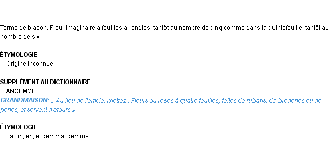Signification développée en 1876 par Mr Littré (dictionnaire dit d’Emile Littré).Merci à Mélissa et Danièle pour la numérisation du mot angemme ou angenne.