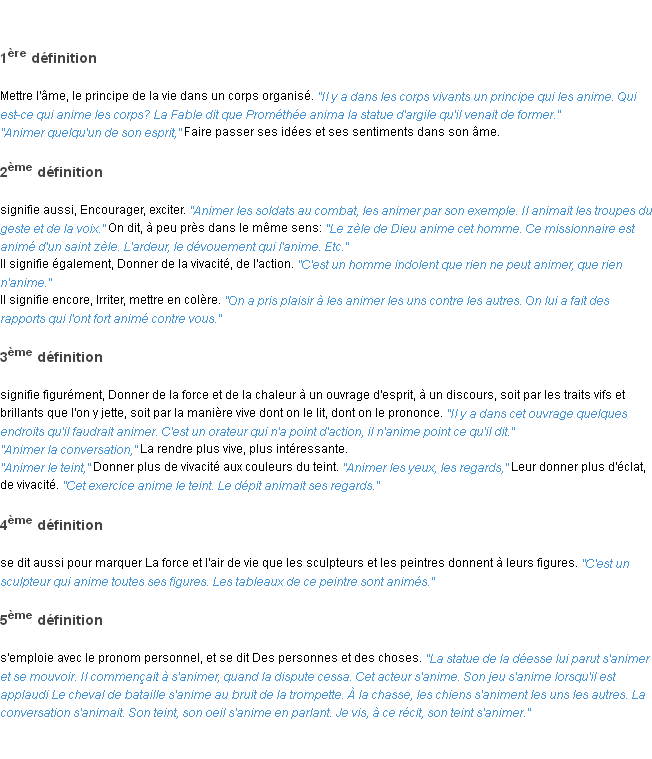 Ancienne signification développée en 1798 par l’académie Française (ACAD - 1798).Merci à Pascal et Ozanne pour la numérisation du mot animer.