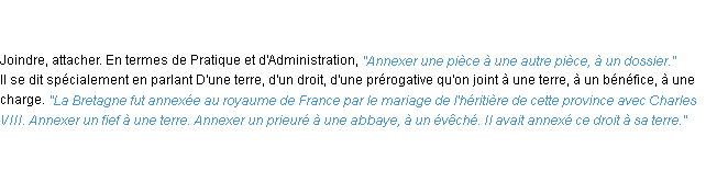 Ancienne signification parue en 1798 dans dictionnaire de l’Académie Française.Merci à Patrice et Emeline pour la numérisation du mot annexer.