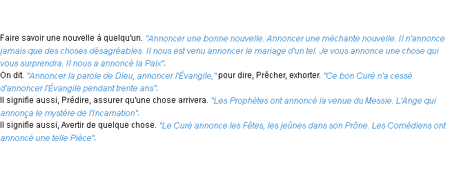 Ancienne définition développée dans dictionnaire académique, 1798.Merci à Christophe et Hugues pour la numérisation du mot annoncer.