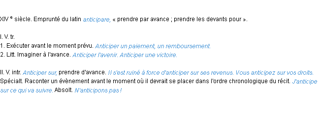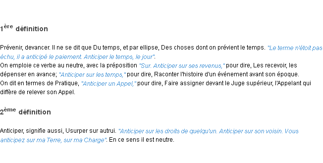 Ancienne signification développée en 1798 par l’académie Française (ACAD - 1798).Merci à Félix et Luce pour la numérisation du mot anticiper.