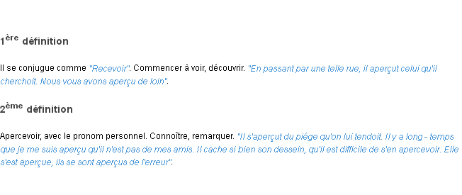 Ancienne signification développée en 1798 par l’académie Française (ACAD - 1798).Merci à Léa et Gratien pour la numérisation du mot apercevoir.