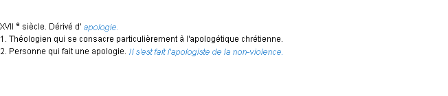 Ancienne signification développée en 1798 par l’académie Française (ACAD - 1798).Merci à Désirée et Lucie pour la numérisation du mot apologiste.