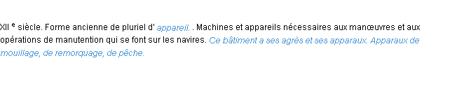 Ancienne définition académique pour le terme « apparaux » (parue en 1798).Merci à Dominique et Baptiste pour la numérisation du mot apparaux.