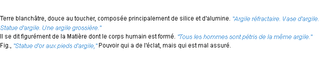 Ancienne signification parue en 1798 dans dictionnaire de l’Académie Française.Merci à Paule et Noella pour la numérisation du mot argile.
