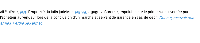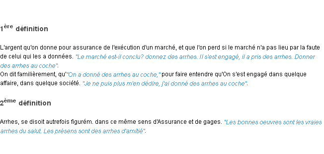 Ancienne définition « arrhes » du dictionnaire académique Français, parution de l’année 1798.Merci à Suzanne et Léandre pour la numérisation du mot arrhes.