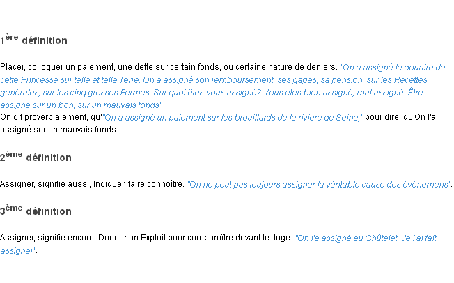 Ancienne définition du mot « assigner » par l’Académie Française (édition de 1798).Merci à Papillion et Laurette pour la numérisation du mot assigner.