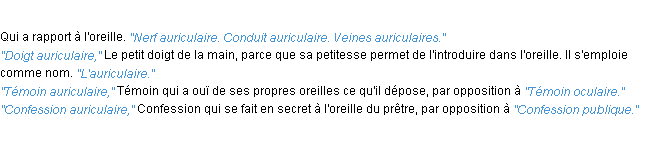 Ancienne signification parue en 1798 dans dictionnaire de l’Académie Française.Merci à Blaise et Baudouin pour la numérisation du mot auriculaire.