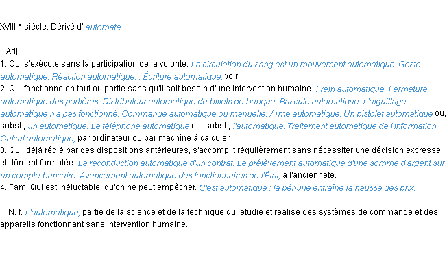 Signification du terme « automatique », parution de 1986, dictionnaire académique Français.