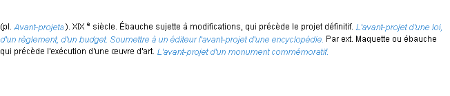 Signification développée en 1876 par Mr Littré (dictionnaire dit d’Emile Littré).Merci à Nicolas et Andrée pour la numérisation du mot avant-projet.