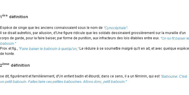 Ancienne signification développée en 1798 par l’académie Française (ACAD - 1798).Merci à Papillion et Marielle pour la numérisation du mot babouin.
