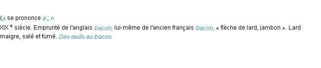 Signification éditée en 2008 pour le terme « bacon » par l’équipe de wiktionary France.Merci à Placide et Irène pour la numérisation du mot bacon.