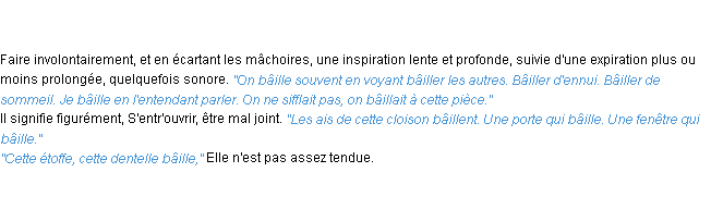 Définition de l’équipe de la-definition.fr (édition de 2009) pour le mot « bailler ».Merci à Alain et Germain pour la numérisation du mot bailler.