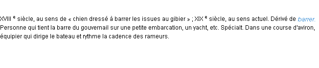 Définition issue du dictionnaire wiktionary pour le mot « barreur ».- Autres Recherches