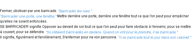 Ancienne définition de « barricader » de source académique (Académie Française, parution de 1798).