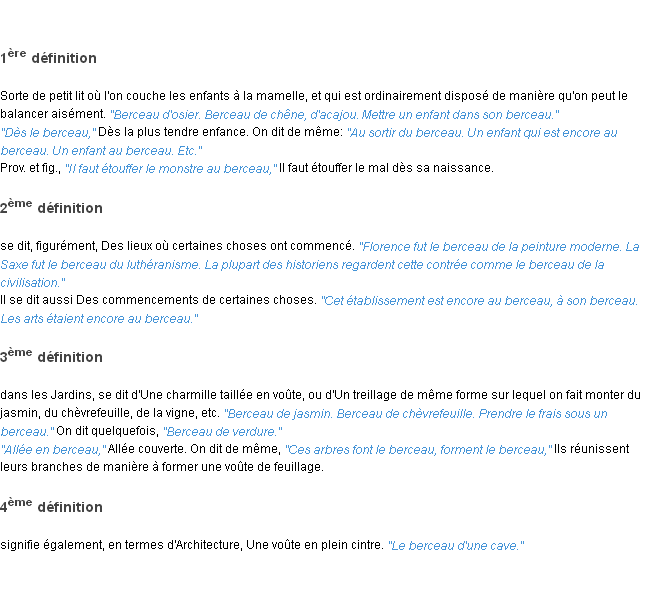 Ancienne signification du terme « berceau », parution de 1835, dictionnaire académique Français.