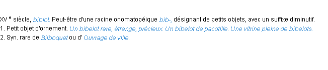 Signification éditée en 2008 pour le terme « bibelot » par l’équipe de wiktionary France.Merci à Suzette et Lunete pour la numérisation du mot bibelot.