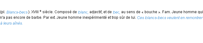 Ancienne signification issue du dico de l’Académie Française, parue en 1798.Merci à Laurent et Laurentine pour la numérisation du mot blanc-bec.