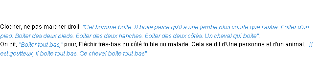 Ancienne signification développée en 1798 par l’académie Française (ACAD - 1798).Merci à Adélaïde et Sylviane pour la numérisation du mot boiter.
