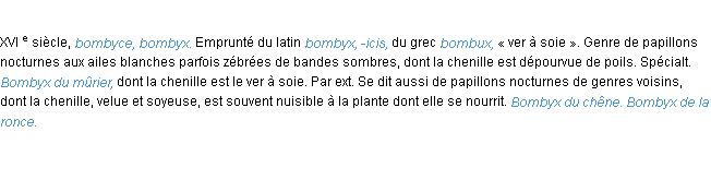 Définition d’Emile Littré (édition de 1876) pour le mot « bombyx ».Merci à Maxime et Aude pour la numérisation du mot bombyx.