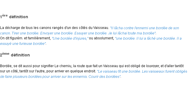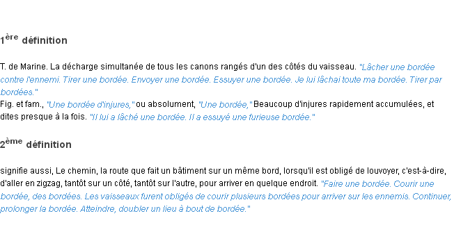 Ancienne signification éditée en 1798 pour le terme « bordée » par l’Académie Française.Merci à Véronique et Jacques pour la numérisation du mot bordée.