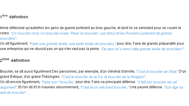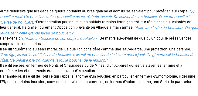 Ancienne signification parue en 1798 dans dictionnaire de l’Académie Française.Merci à Irène et Grégoire pour la numérisation du mot bouclier.