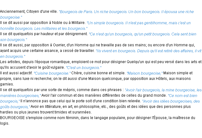 Signification du terme « bourgeois », parution de 1986, dictionnaire académique Français.