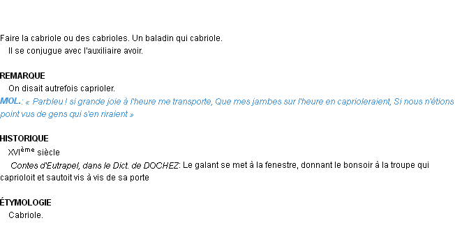 Signification éditée en 1986 pour le terme « cabrioler » par l’Académie Française.