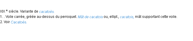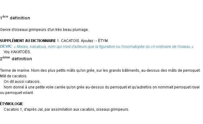 Signification éditée en 1876 pour le terme « cacatois » par Emile Littré.Merci à Guillaume et Clementine pour la numérisation du mot cacatois.