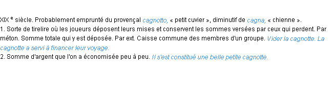 Définition « cagnotte » du dictionnaire académique Français, parution de l’année 1932.Merci à Mignon et Joséphine pour la numérisation du mot cagnotte.