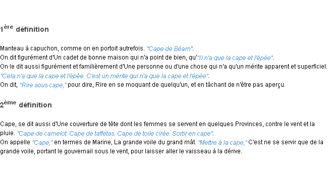 Signification éditée en 1932 pour le terme « cape » par l’Académie Française.