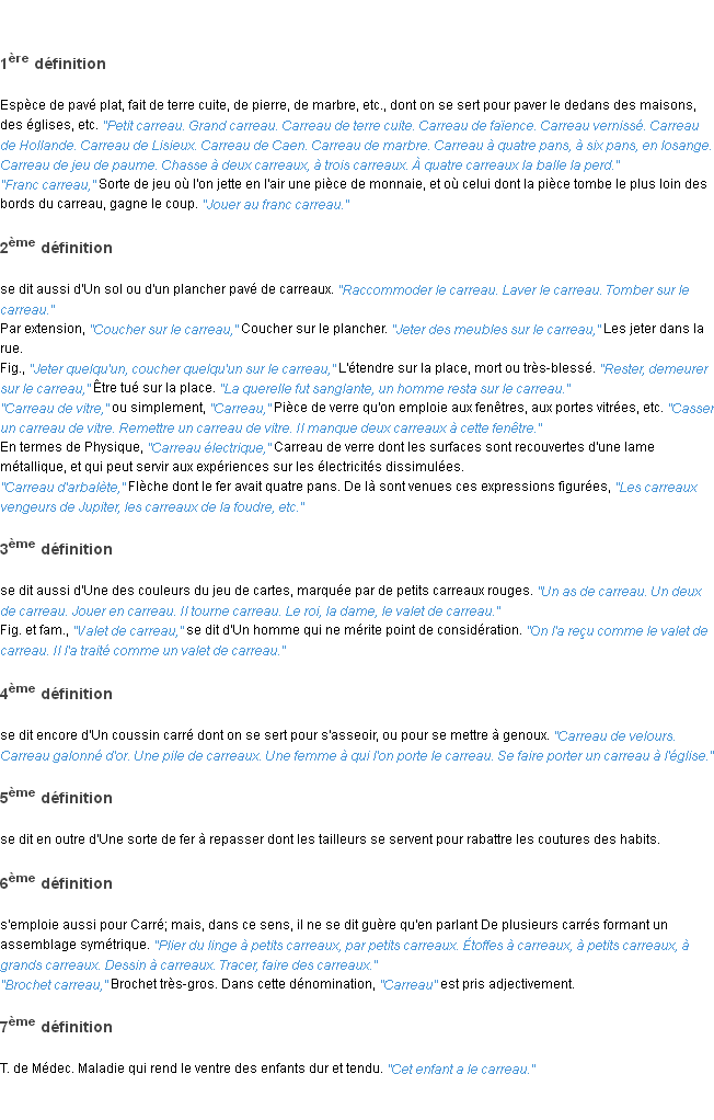 Ancienne définition académique pour le terme « carreau » (parue en 1835).