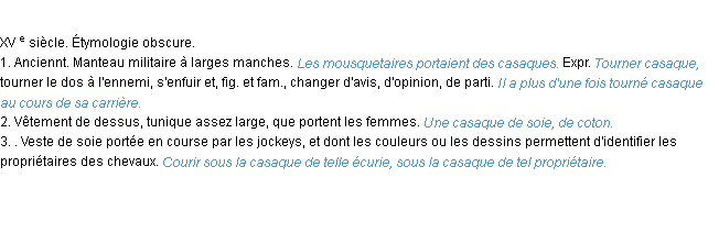 Ancienne signification développée en 1798 par l’académie Française (ACAD - 1798).Merci à Céleste et Gaston pour la numérisation du mot casaque.